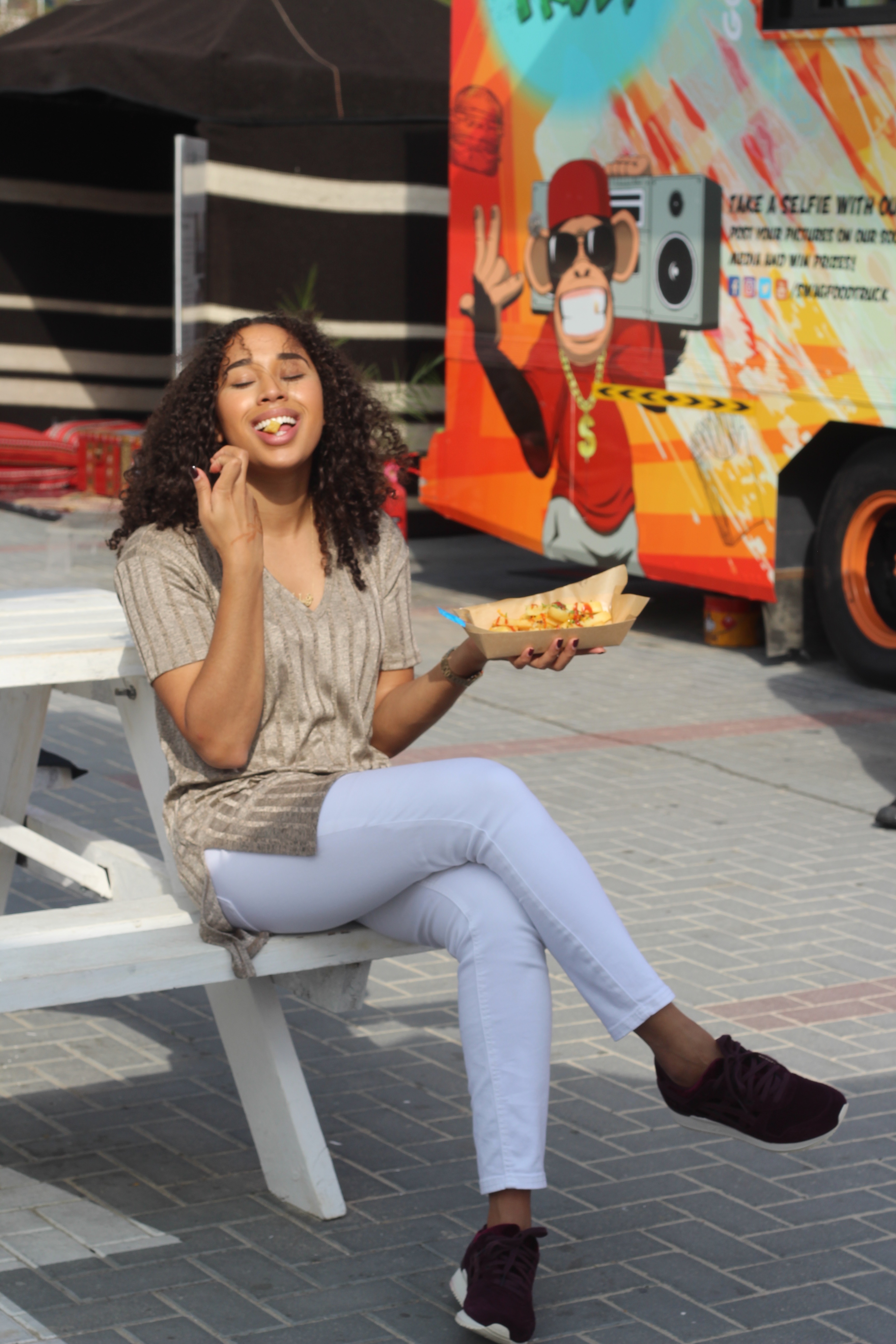 It might be one of the best times for a foodie in Dubai. Dubai Food Festival is set from Feb 23 to March to highlight Dubai’s unique international food scene. I was so excited to visit the Etisalat Beach Canteen behind in Jumeirah to try out the food trucks and stands. I planned smart with the oversized shirt because I already knew I was about to go in on these trucks.
